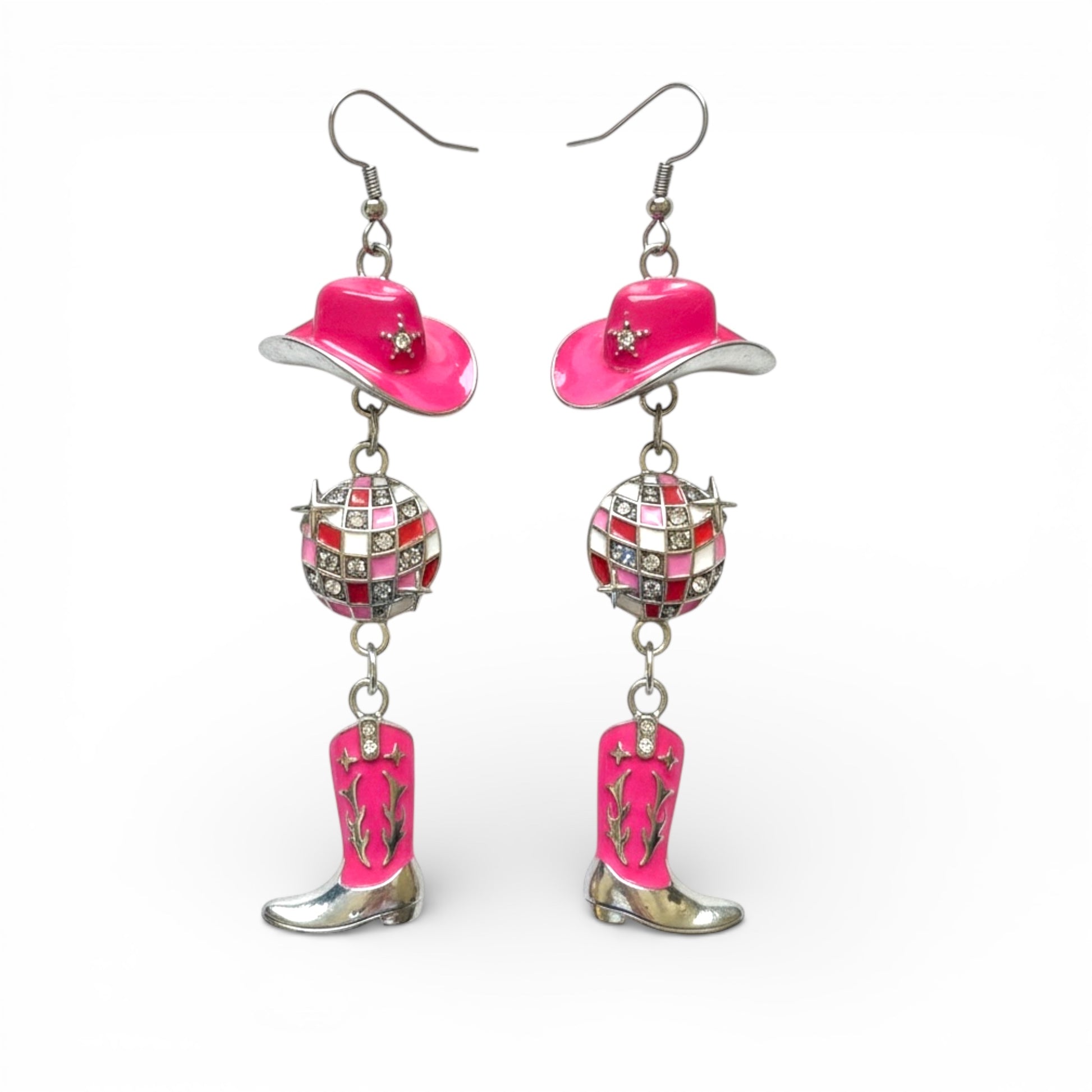 Disco Cowgirl β Yeehaw meets Saturday night! Featuring a red cowgirl hat, rhinestone disco ball, and pink cowboy boots β total showstopper!