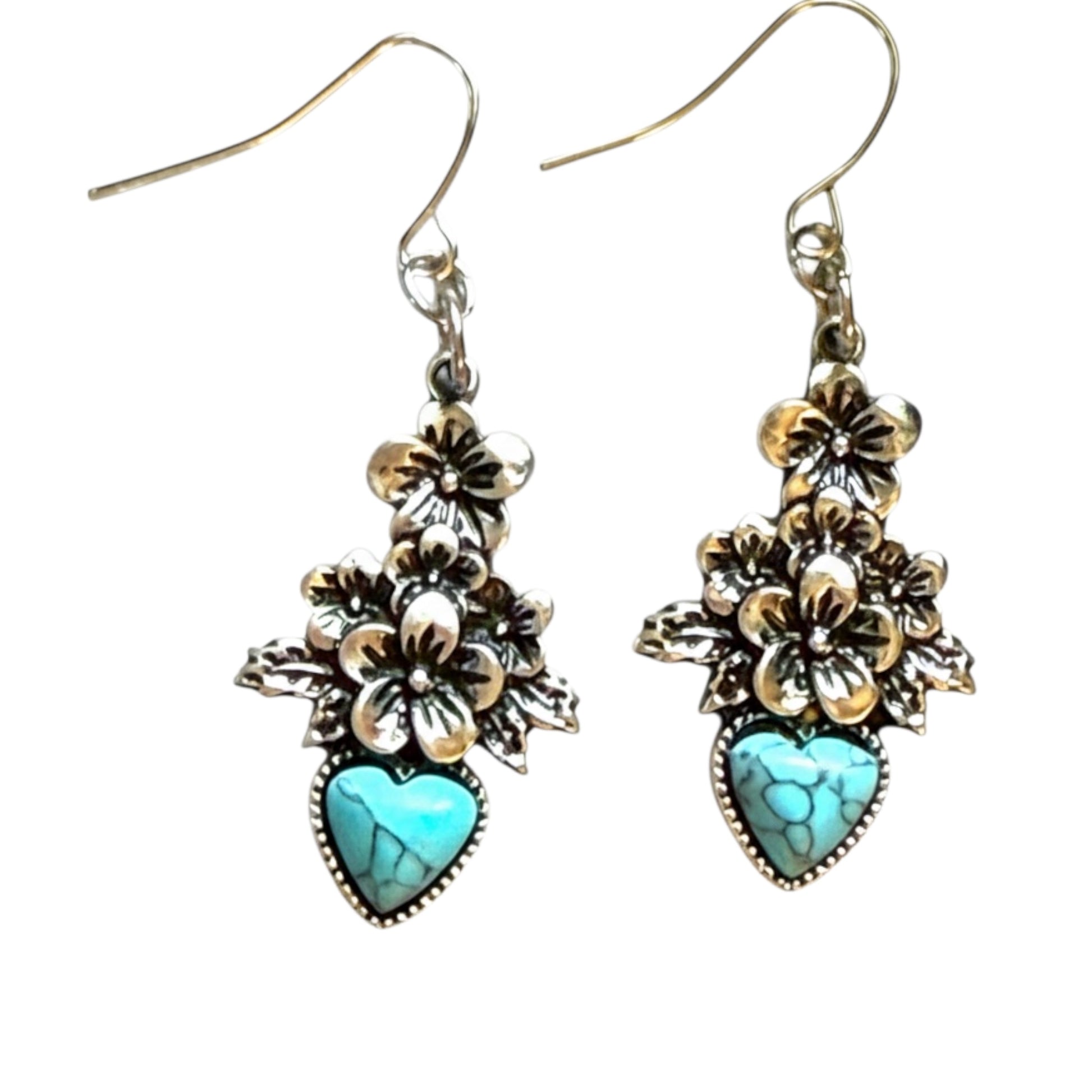 Turquoise Heart Blossoms β Floral silver medallions bloom around a turquoise heart stone π Perfect blend of rustic and romantic.