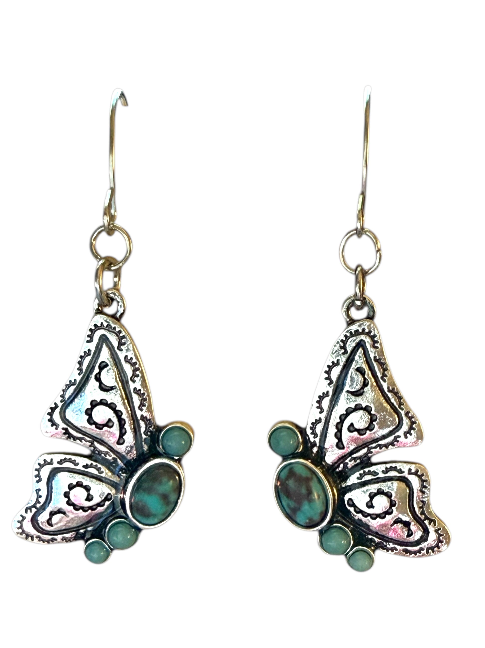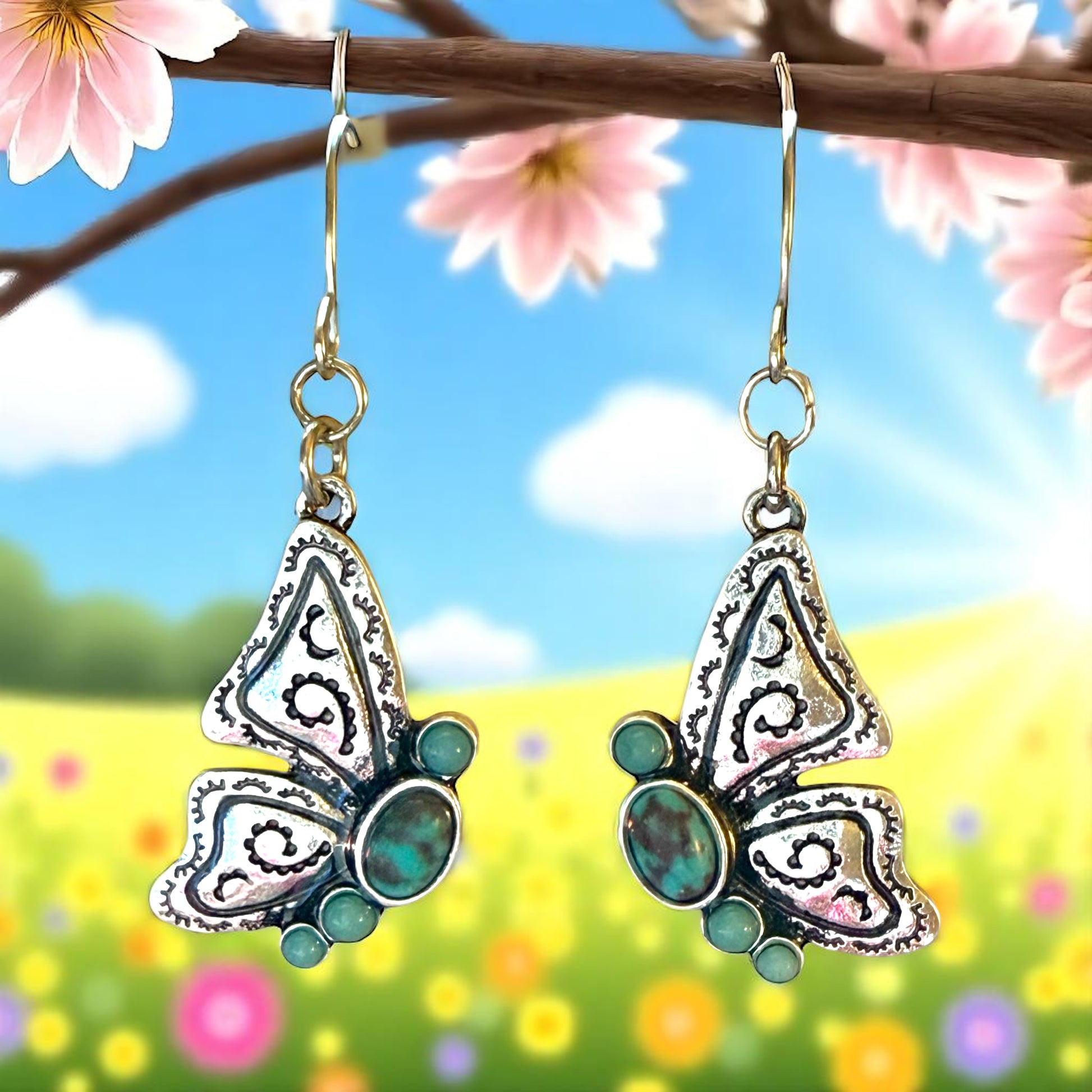 Let your style take flight with our Whimsy Wings Butterfly Earrings, designed for free spirits and nature lovers ๐ธ๐ฆ These stunning silver-toned butterflies feature intricate engraved wing patterns paired with beautiful turquoise stone inlays on each wing and body. The earthy blend of silver and green brings a grounded, healing energyโperfect for everyday wear or adding a whimsical touch to your look. ๐โจ